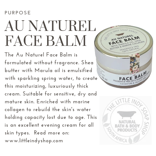 The Au Naturel, fragrance free face balm, is formulated with natural peptide rich, marula oil, shea butter and hydrosol (plant essense enriched distilled water). Fortified with Marine Collagen and Hyaluronic acid. Formulated for aging skin and suitable for the very sensitive. This face balm will not dissapoint.
