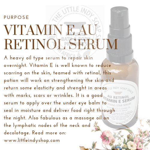 Evening Star Serum - Rich Vitamin E oil with retinol. Both ingredients known to stimulate deep skin cell renewal. Potentially good for wrinkles, grooves and to repair damaged skin. Use in the evenings only. Retinol might make the skin more sensitive to sun. So be sure to use UV protection on the skin while in the sun.